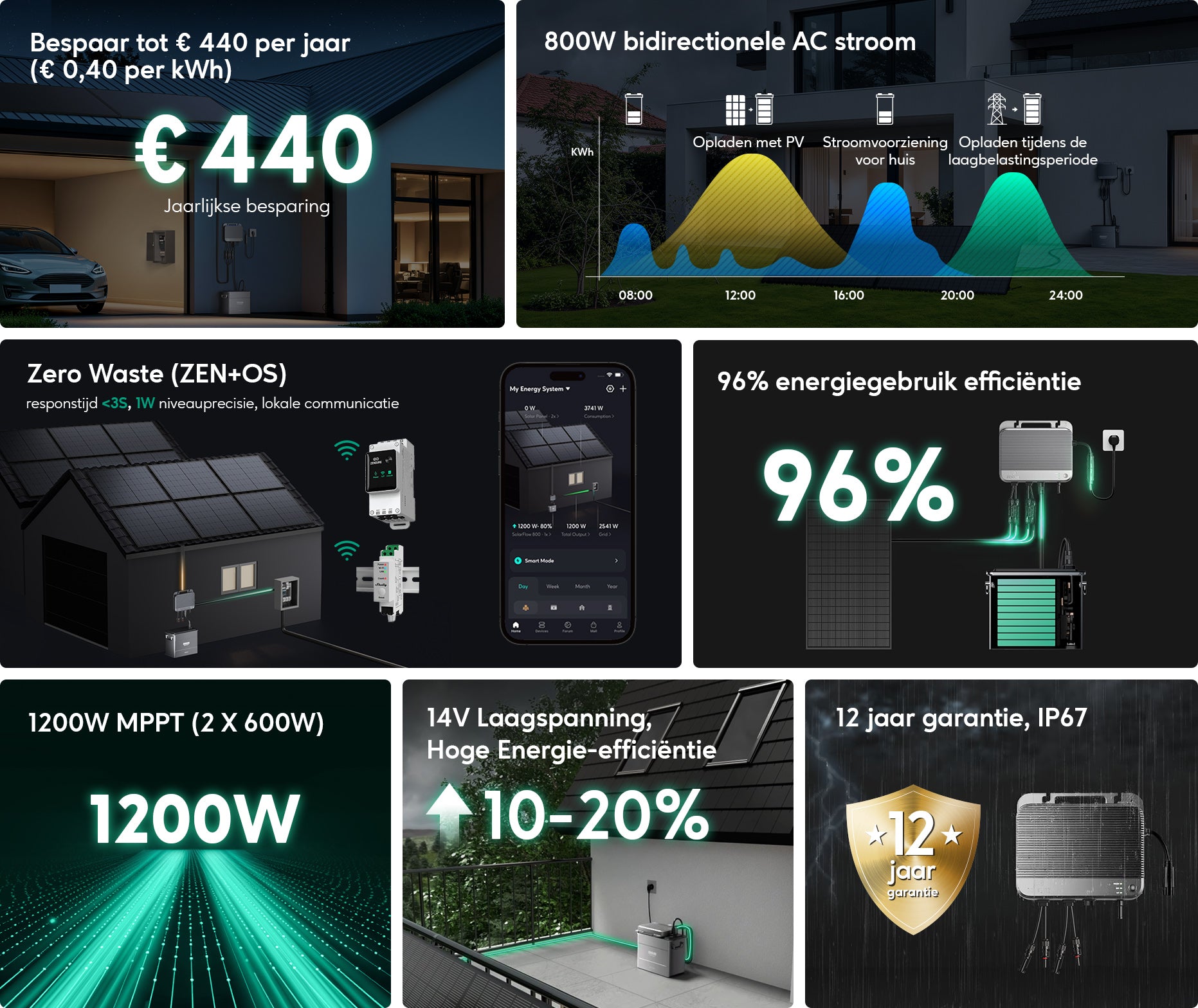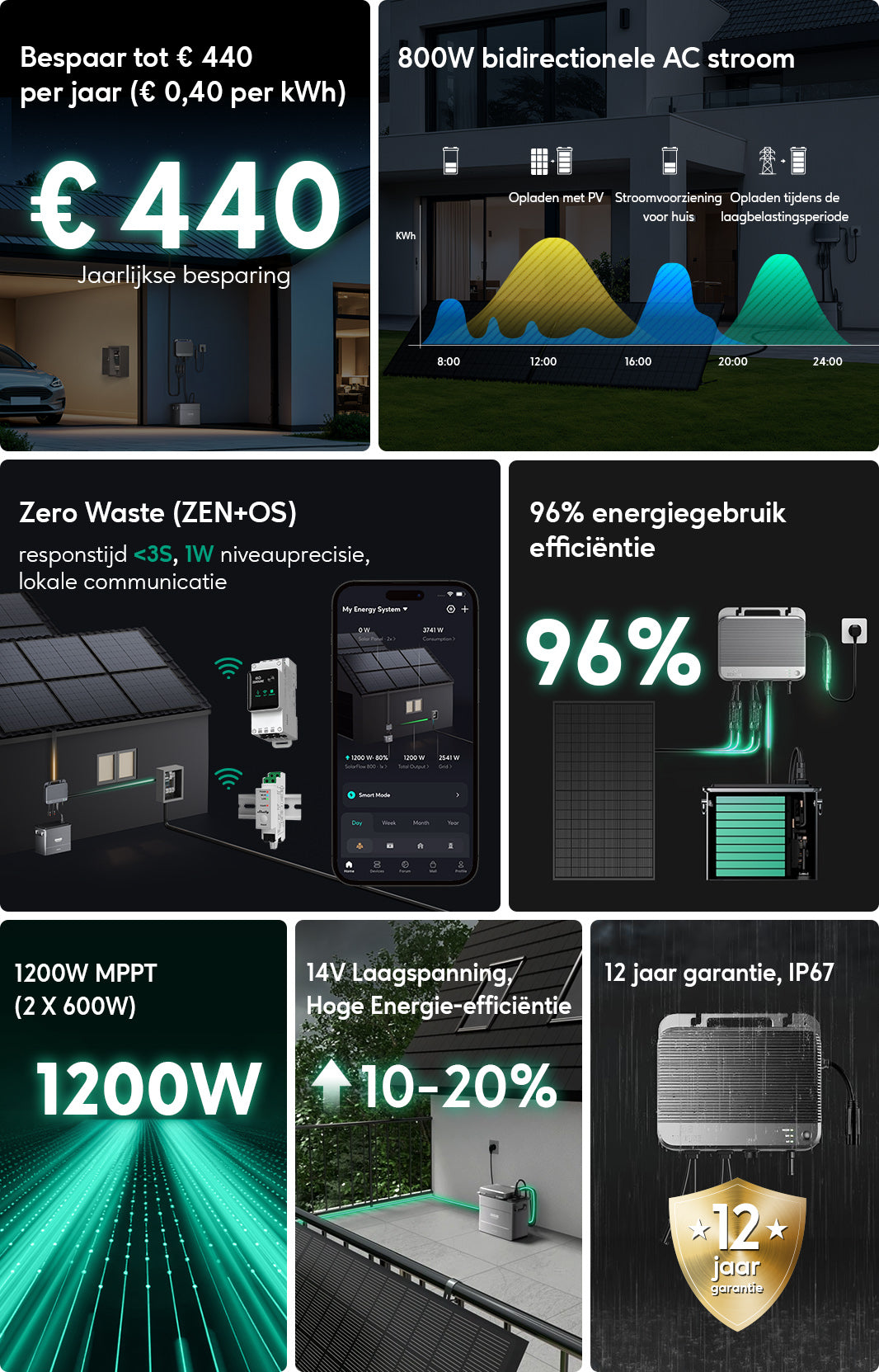 De SolarFlow 800, de revolutionaire hybride micro-omvormer genereert 50% meer stroom dan conventionele systemen en slaat overtollige energie op intelligente wijze op in batterijen. Door energie dynamisch toe te wijzen, via bidirectionele AC, minimaliseert de SolarFlow 800 uw afhankelijkheid van het elektriciteitsnet en maximaliseert u uw besparingen.
