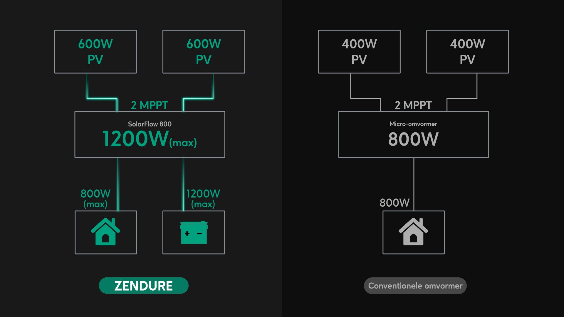 SolarFlow 800 ondersteunt 1200W (2 × 600W) MPPT, wat betekent dat er zelfs bij gemiddeld huishoudelijk verbruik nog genoeg over is om de batterij op te laden.