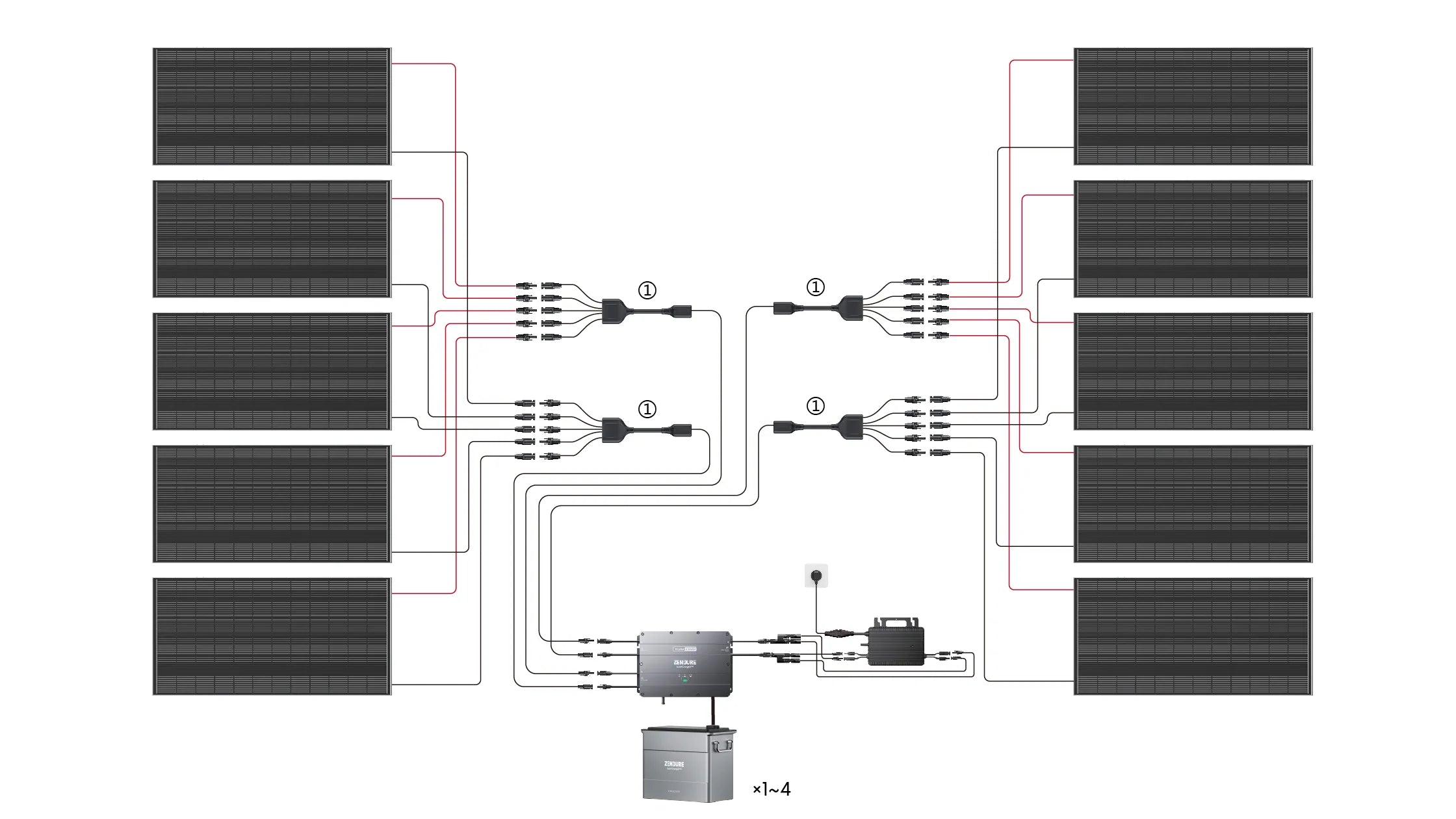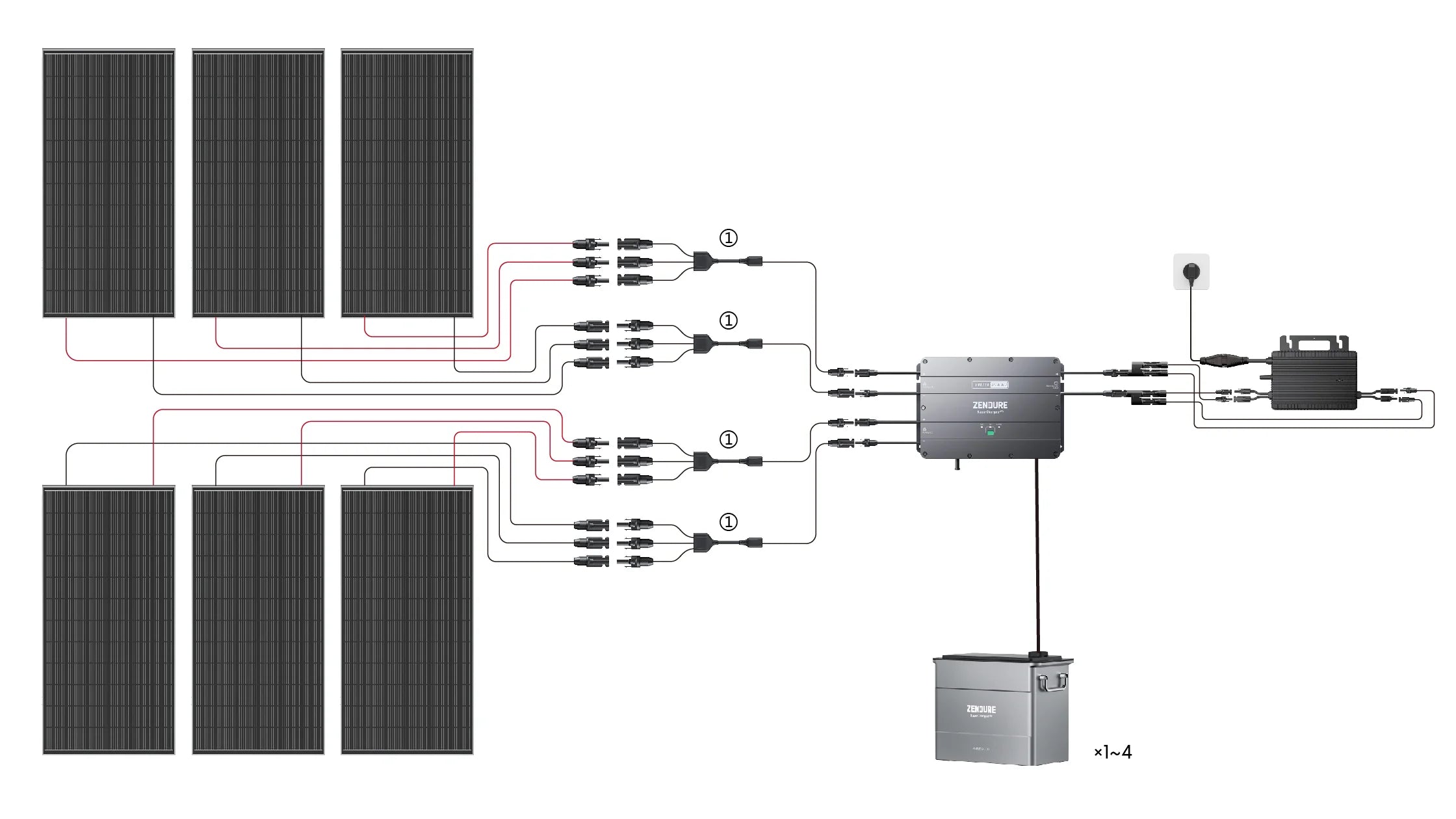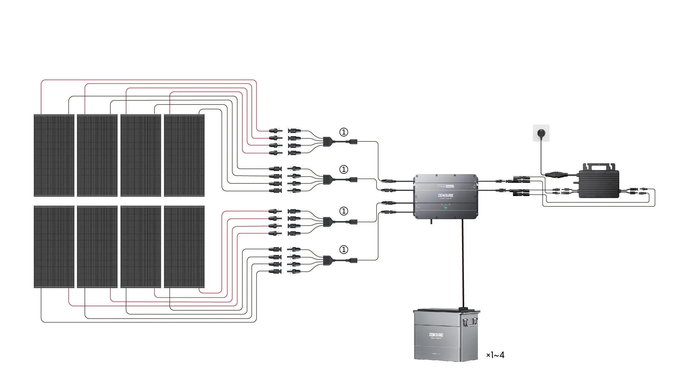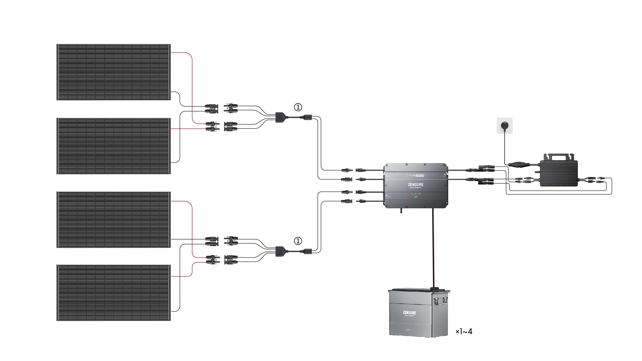 Elke MPPT van de Hub 2000 is compatibel met zonnepanelen die een spanning tussen 16 V en 60 V leveren en een stroom van minder dan 32 A. Bij het aansluiten van meerdere zonnepanelen op één MPPT-ingang moeten deze parallel worden aangesloten om compatibiliteit en optimale prestaties te garanderen.*Let op: De kabels ① die in de onderstaande afbeeldingen worden weergegeven, zijn Y-vormige parallelle zonnepaneelkabels, beschikbaar in verschillende configuraties: parallelle zonnepaneelkabels Y 1-3, 1-4, 1-5 en 2-4. Deze zijn te koop, en we hebben momenteel de parallelle zonnepaneelkabel Y 2-4 op voorraad. Klik hier om te bestellen.