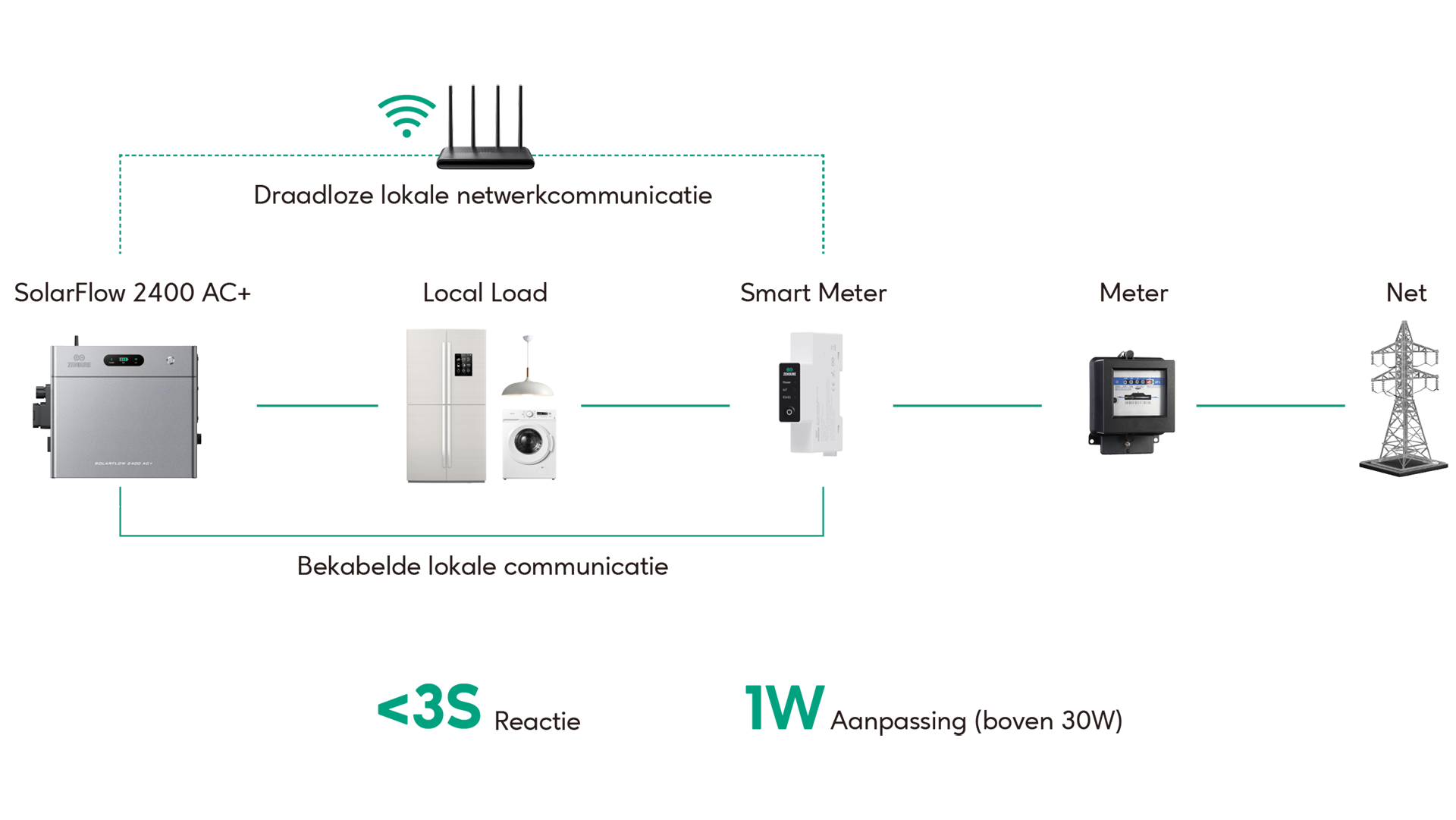 De slimme meter past het vermogen dynamisch aan op basis van de realtime huishoudelijke belasting, zodat de opgewekte elektriciteit overeenkomt met het verbruik en terugleververlies wordt vermeden.