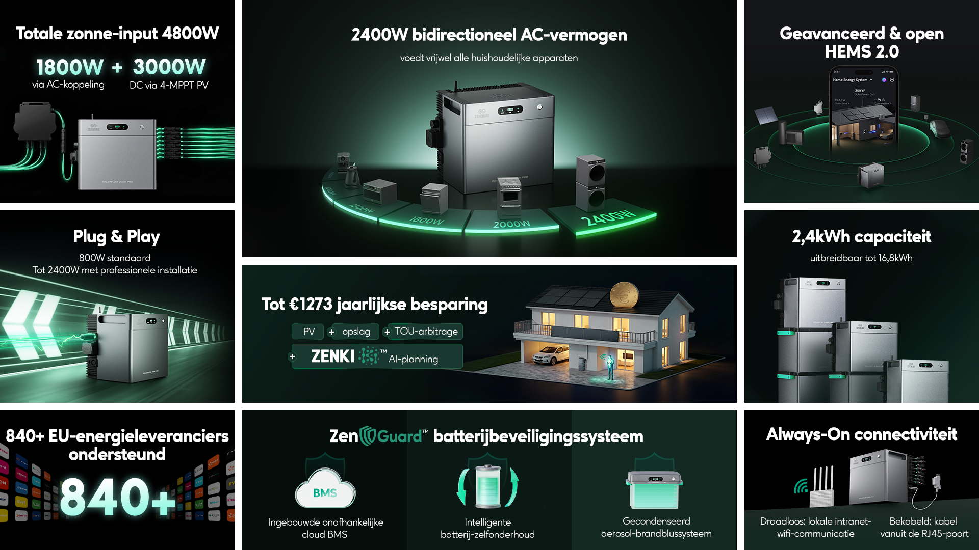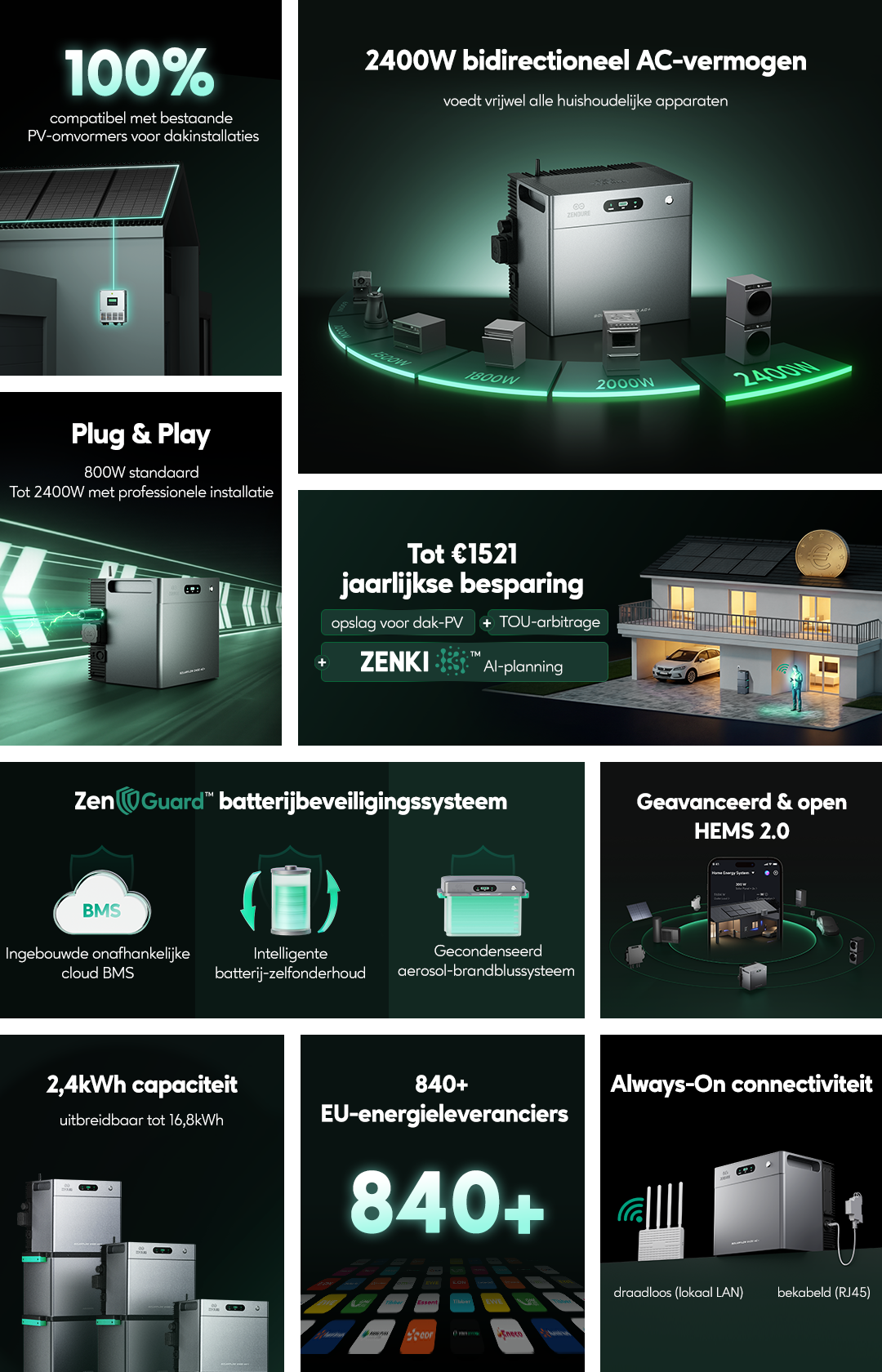 Het kan samenwerken met Zendure Smart Meter 3CT, Smart Meter D0/P1, Shelly Pro 3EM, Shelly 3EM, Everhome Ecotracker IR en HomeWizard P1 Meter, waardoor automatische vermogensregeling mogelijk is.