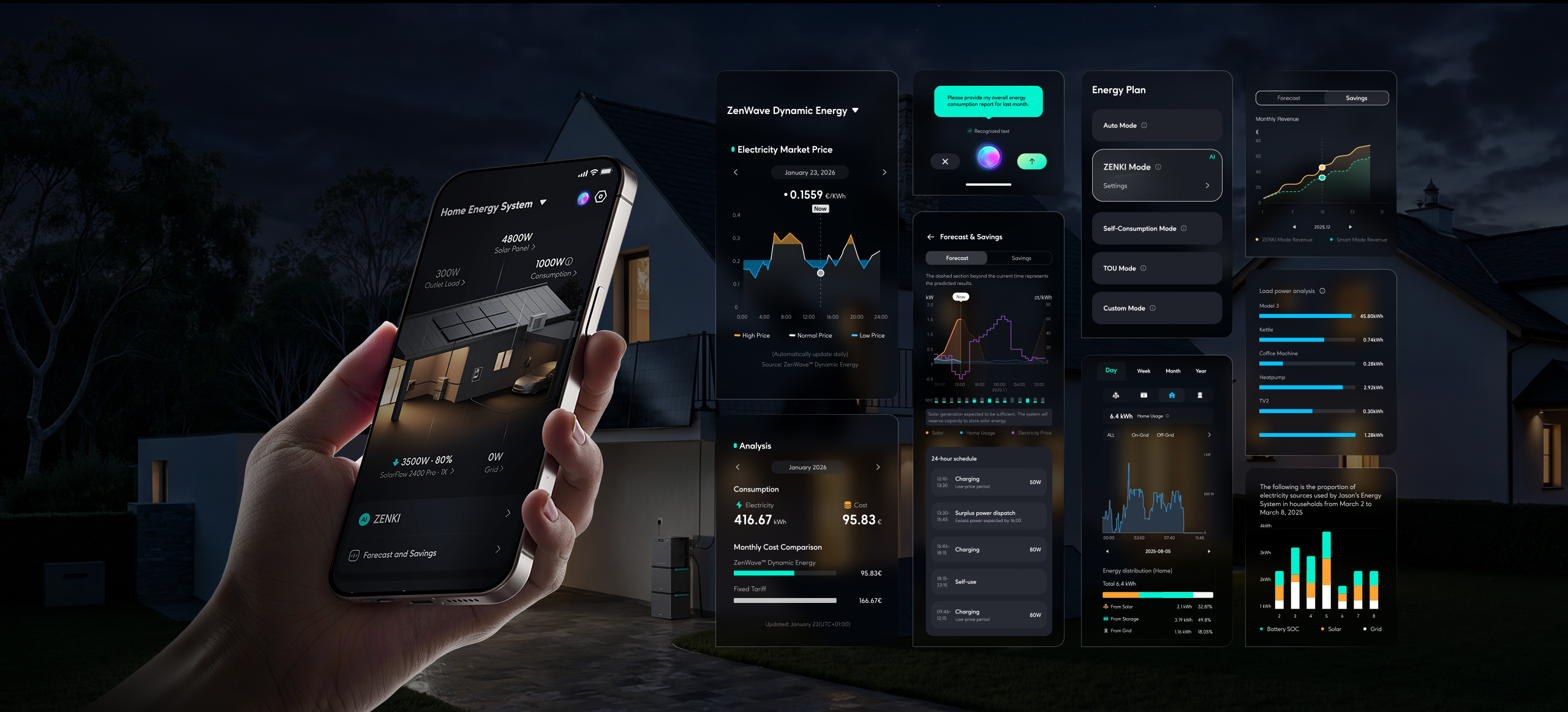 ZENKI™ 2.0 leert je verbruikspatronen en voorspelt PV-opbrengst en elektriciteitsprijzen om laden en ontladen te automatiseren: