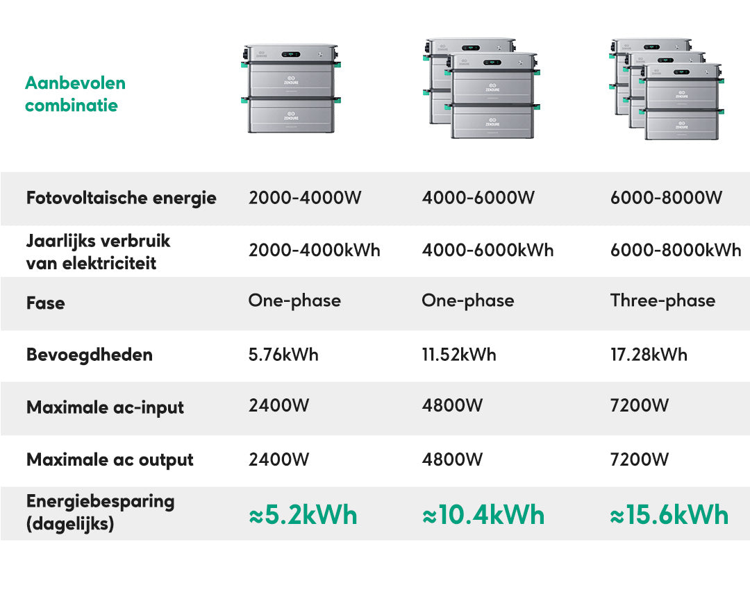 *Bij een vermogen boven 2400W of capaciteit >15 kWh: raadpleeg een elektricien voor veilige installatie.